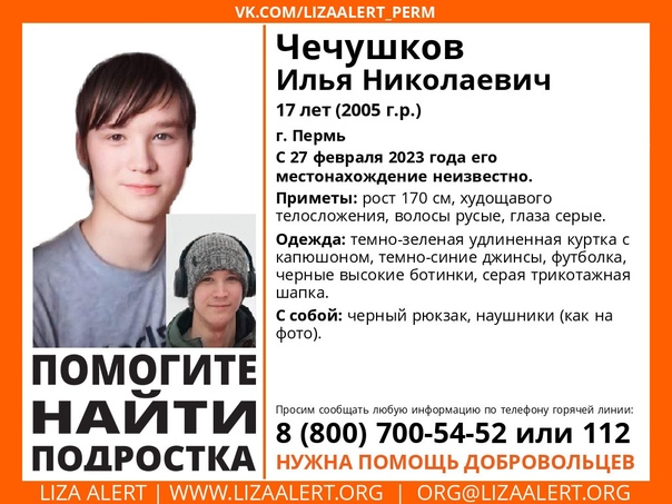 В течение последних двух недель в Перми разыскивают пропавшего 17-летнего Илью. По информации, полученной от родственников, молодой человек прибыл на пермский автовокзал утром 27 февраля из Березников и исчез без вести. Он не появлялся в школе, что вызвало беспокойство у близких.