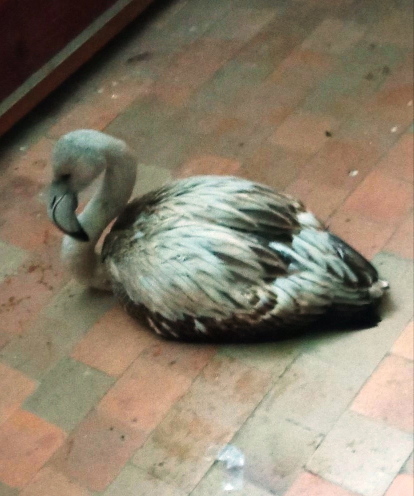 Молодого фламинго нашли на дороге, куда он упал от усталости. Его подобрали и отвезли в ветеринарную клинику, где ему оказали помощь. По словам специалистов, птица в хорошем состоянии и скоро сможет вернуться в свою среду обитания.