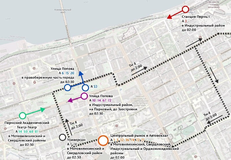 В правобережную часть города будут курсировать автобусы маршрутов №6, №15, №20 и №53 от остановок «Улица Попова». Для поездок в Мотовилихинский, Орджоникидзевский и Свердловский районы пассажиры смогут воспользоваться автобусами №14, №50, №68, №81 от остановки «Пермский академический Театр-Театр», а также автобусами №32, №36 и №77 от центрального рынка и автовокзала.