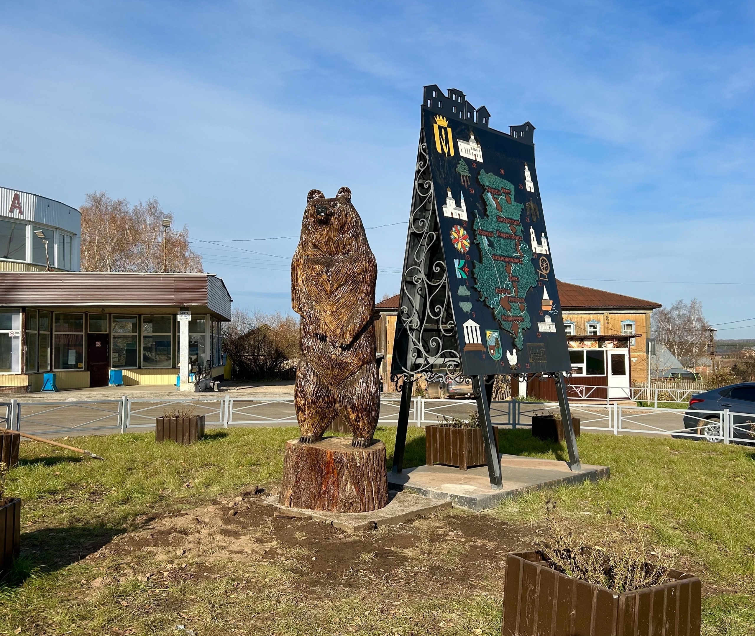 Могучий деревянный медведь появился на привокзальной площади села Карагай