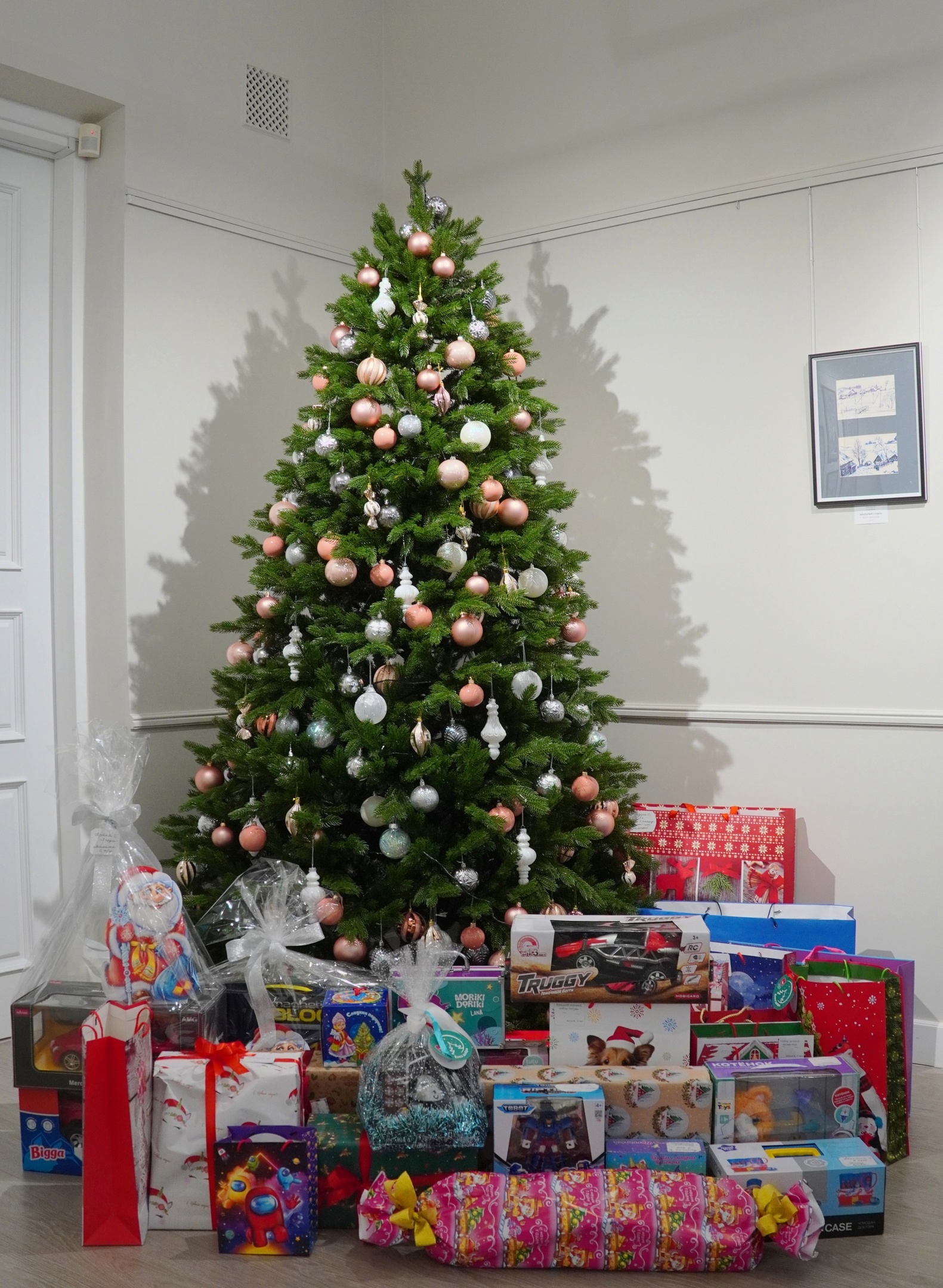 Как и в предыдущие годы, в Белой гостиной Думы была установлена елка, украшенная шарами-открытками с детскими просьбами.