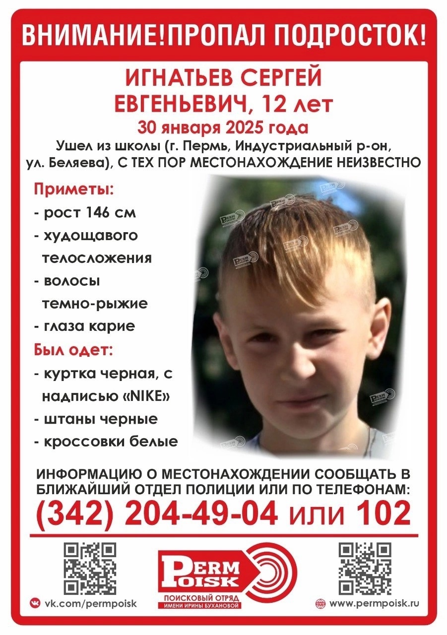 30 января в Перми пропал 12-летний мальчик.