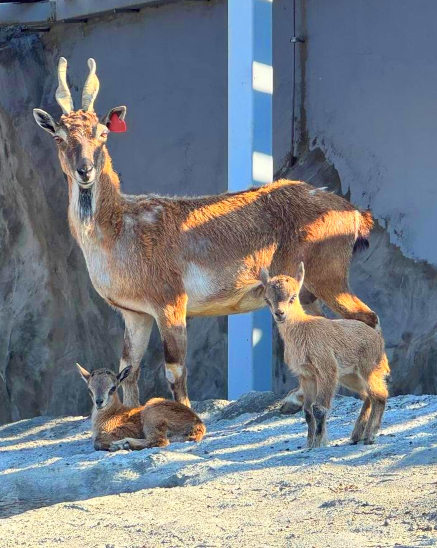 В семье винторогих коз Марго и Москвича — прибавление: появились на свет две самки. Малютки уже бодро бегают за мамой, а наблюдать за ними можно будет после открытия нового зоопарка