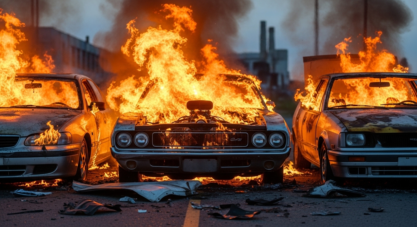 на улице Куфонина сгорели сразу семь машин. По словам жителей, всё началось с поджога Mercedes, от которого огонь мгновенно перекинулся на соседние авто.
