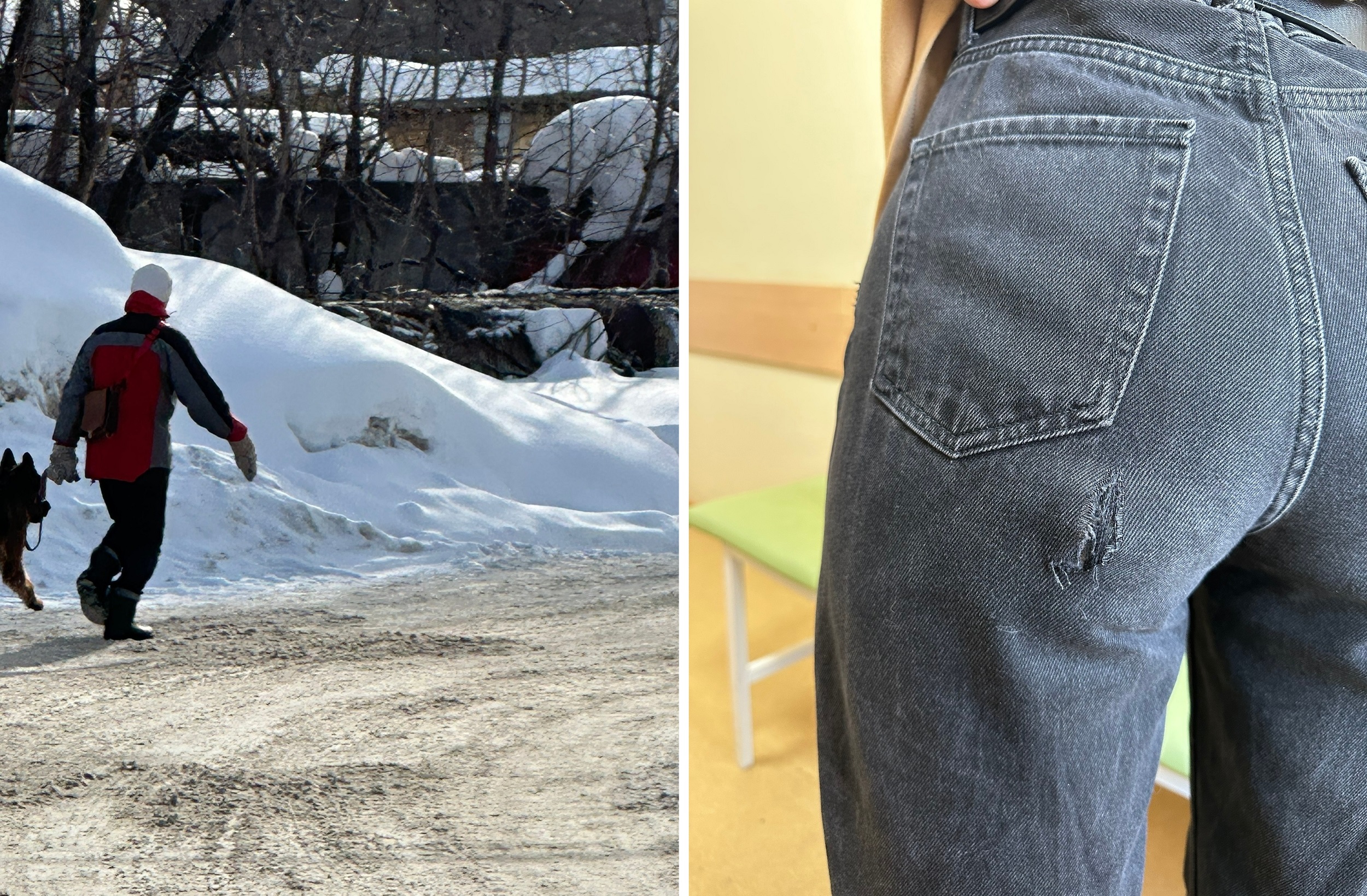 Как сообщает пермячка в социальных сетях, крупная собака, похожая на овчарку, выгуливалась хозяином без намордника. Животное набросилось на женщину, порвало верхнюю одежду и нанесло укушенную рану.