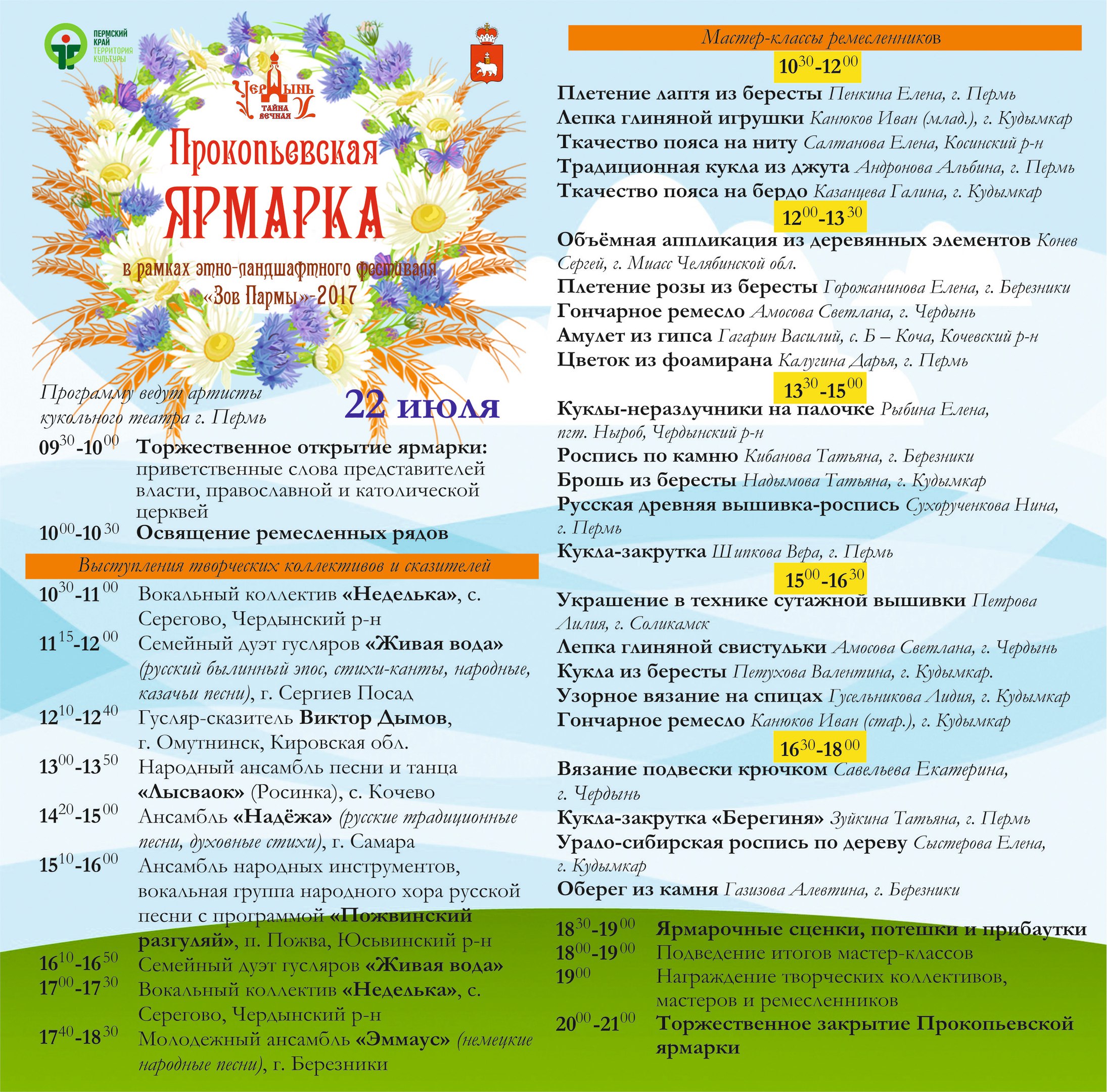 У гостей фестиваля будет возможность побывать в юрте, примерить национальную одежду, приготовить пищу по древним рецептам, а также принять активное участие в Прокопьевской ярмарке. Здесь гостей ждет выставка-продажа изделий народных промыслов и ремесел, концерт-фестиваль сказителей Перми Великой, а также II конкурс мастер-классов декоративно-прикладного искусства, народных художественных промыслов и традиционных ремесел «Душа земли Чердынской».