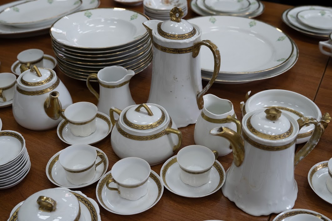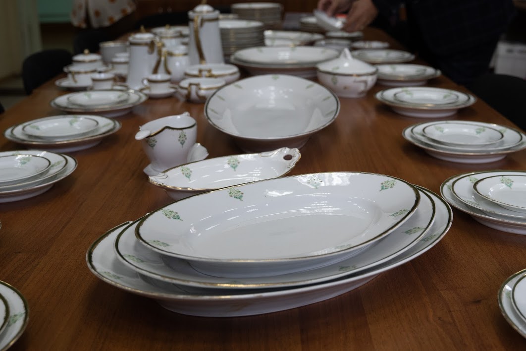 В обеденный сервиз входят огромное блюдо для рыбы, предназначенное для самого центра стола, несколько блюд поменьше для рыбы и мяса, множество тарелок для салатов, первых и вторых блюд.