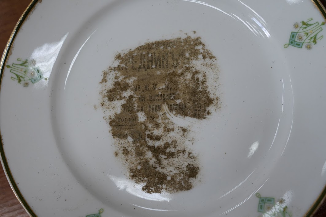 К некоторым блюдцам прилипли кусочки газеты. Учёные не собираются их очищать, скорее планируют залакировать, чтобы сохранить историю жизни и нахождения этого сервиза.