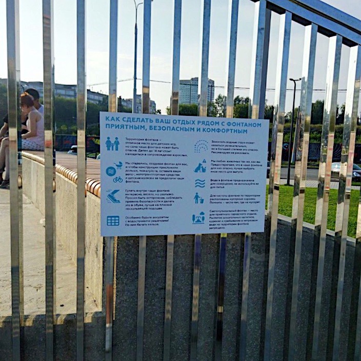 Для безопасного отдыха у фонтана в центре города администрация разработала ряд правил поведения. На входных группах 68-ого квартала разместили пять щитов с советами для безопасного времяпрепровождения. Власти настоятельно рекомендуют ознакомиться с ними и разъяснить их своим детям.