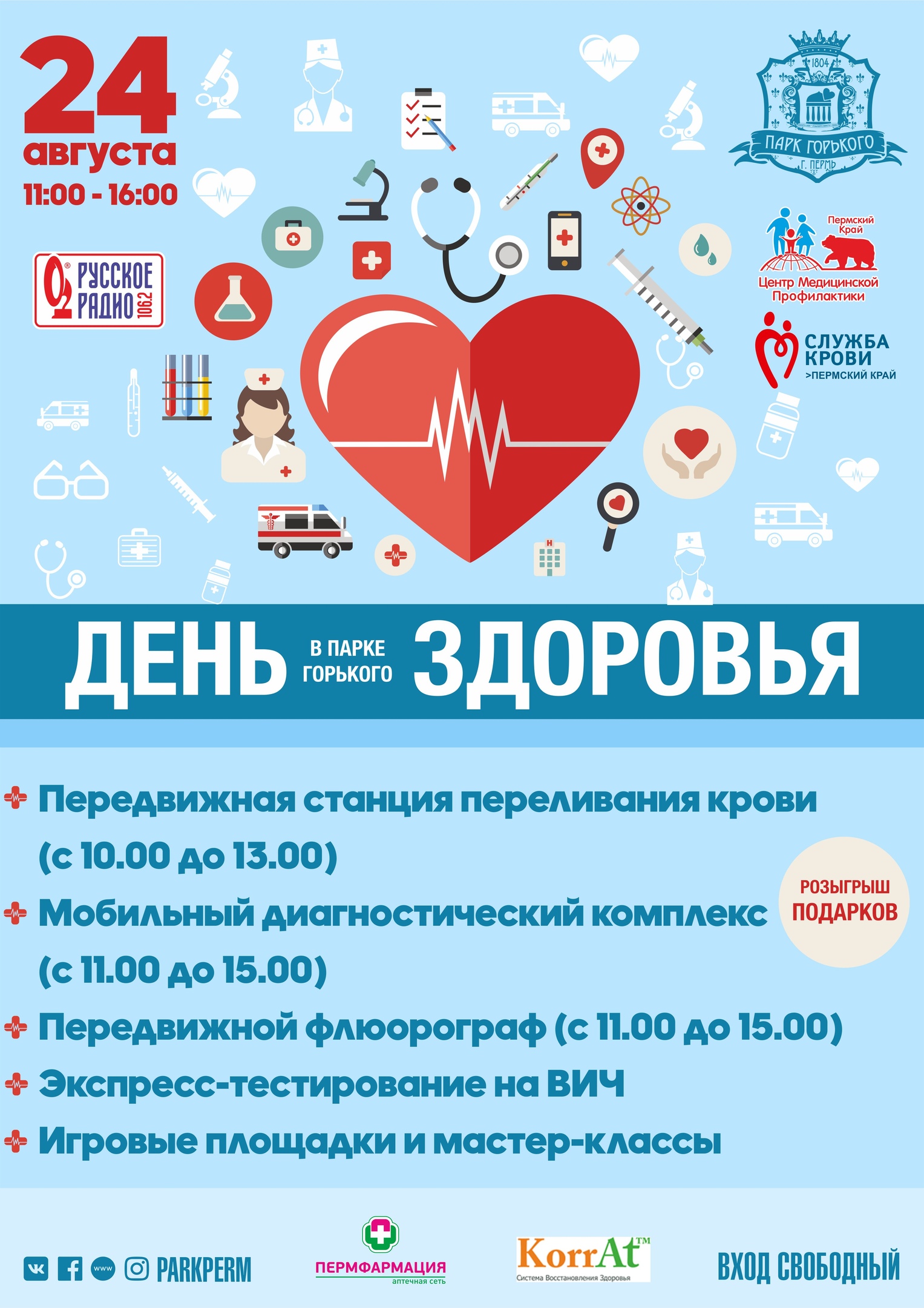 В эту субботу, 24 августа, в Перми пройдёт День здоровья. Люди смогут проверить своё физическое состояние прямо на свежем воздухе — в Парке Горького. Праздник здоровья начнётся с самого утра: в 9:00 откроется Мобильный комплекс Службы крови. Здесь все желающие доноры смогут поделиться кровью с теми, кому она жизненно необходима. Для сдачи крови необходимо соблюдение диеты и питьевого режима, а также паспорт с пропиской на территории Пермского края.