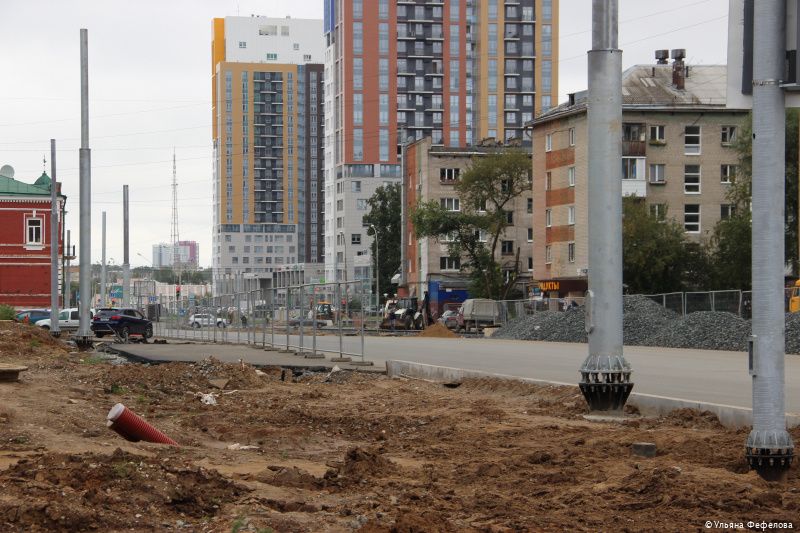 Продолжаются работы на улице Революции. Напомним, участок от улицы Сибирской до ЦКР расширят до четырёх полос (по две в каждую сторону), построят новые трамвайные пути. На данном этапе на участке от улицы Сибирской до Компроса уже полностью уложено дорожное покрытие, выполнены работы по переустройству сетей, наружного освещения, ведутся работы по устройству тротуаров, установке бортового камня и трамвайных путей.