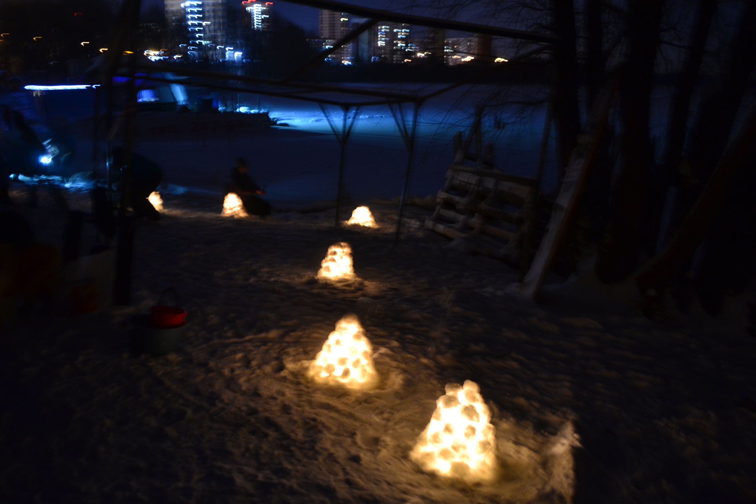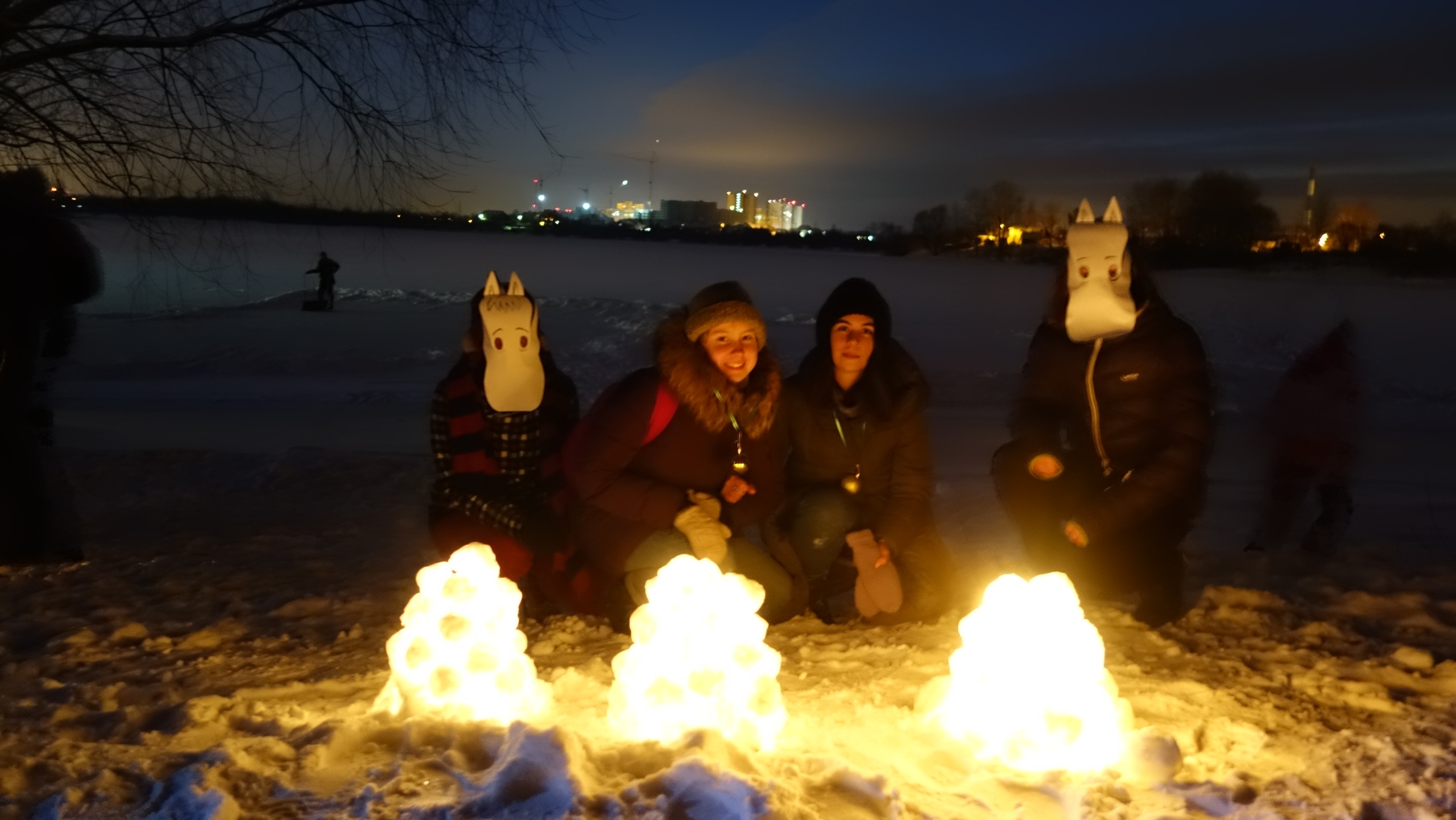 А дальше началось самое интересное...кто-то строил САМЫЙ БОЛЬШОЙ ФОНАРЬ, кто-то 3 маленьких, кто-то применил ноу-хау (закрыли горящую свечку пластиковой бутылкой, а вокруг неё соорудили стенку и бутылку достали). В итоге к концу праздника берег Мулянки освещали 20 фонарей. Чему были очень рады, пришедшие на их свет Муми-тролль и Снорк. Они подарили участникам серебряные снежки и договорились встретиться в следующем году. А после все пили чай с вкусняшками в доме Куполе и не хотели расходиться. Праздник закончен, а фонари остались гореть, радуя местных мальчишек, которые пришли к реке, чтобы покататься на коньках!"