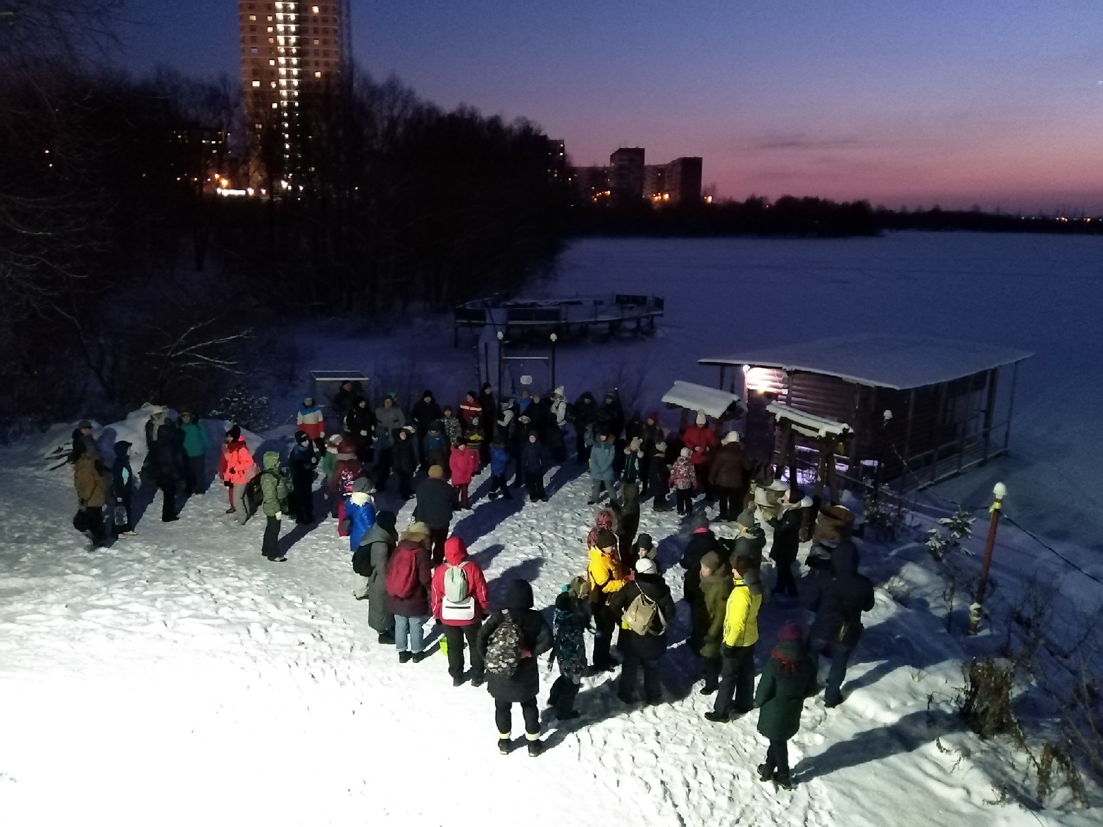"80 человек двигались вдоль проспекта Парковый к реке на ночь глядя. Уже только одно это вызвало удивление местных жителей. Любопытные мальчишки тоже увязались за нашей компанией (совсем нескромной). На берегу реки мы разбились на команды - большие и маленькие...по количеству емкостей для воды. И пока капитаны команд набирали воду из проруби, все согревались мумитролльской разминкой. Спасибо Светлане Карскановой.