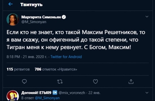 Маргарита Симоньян, главный редактор телеканала «Russia Today» и «МИА Россия сегодня», посвятила твит экс-главе Прикамья Максиму Решетникову. Она написала: