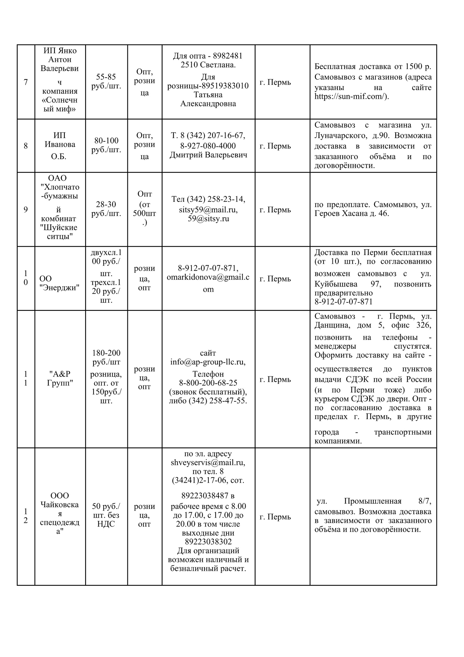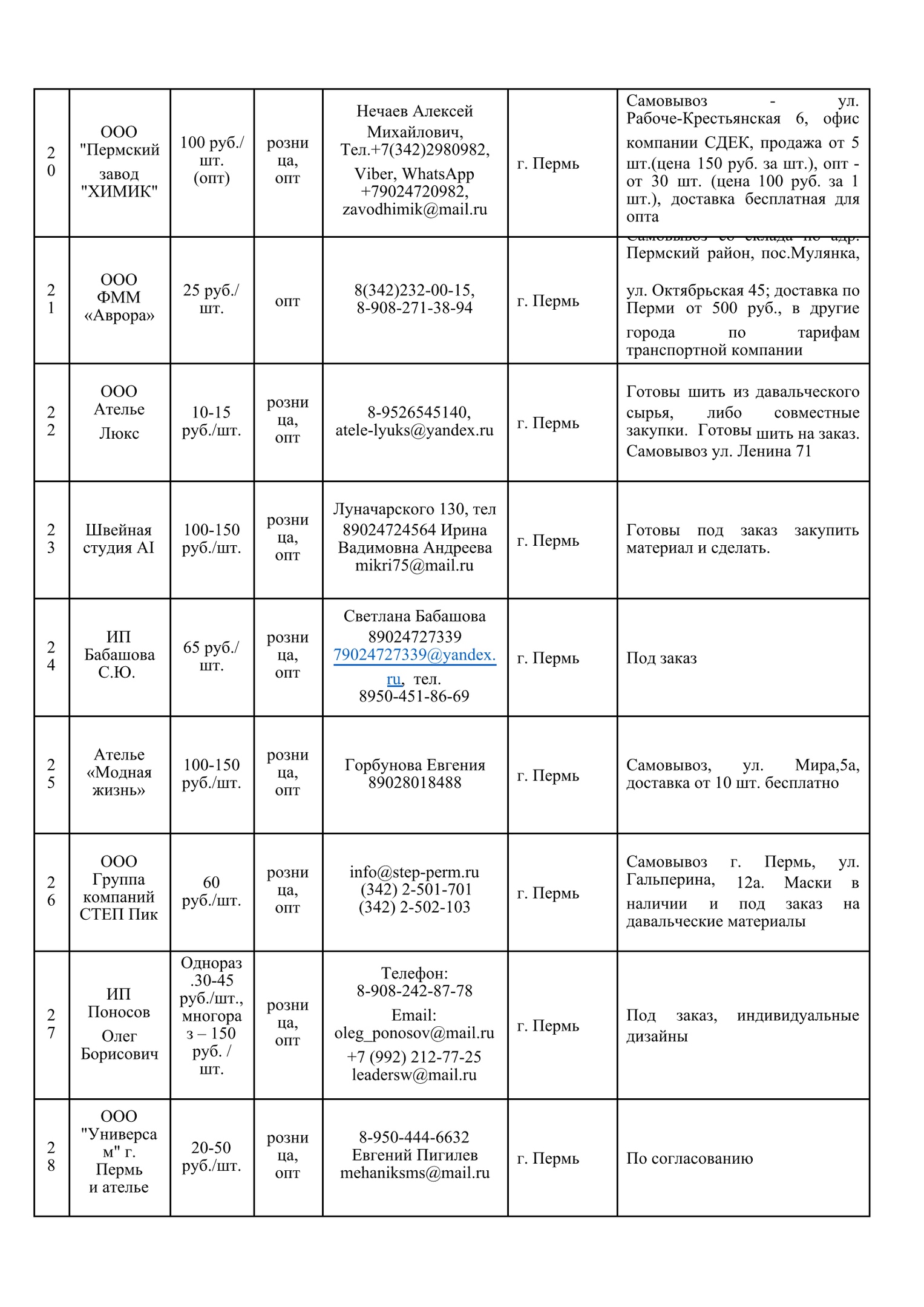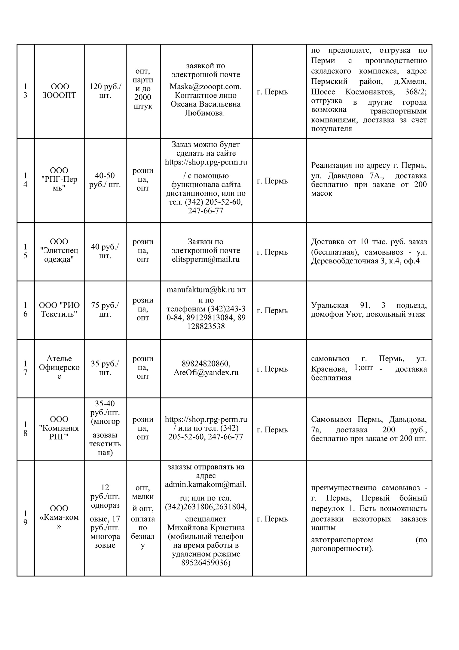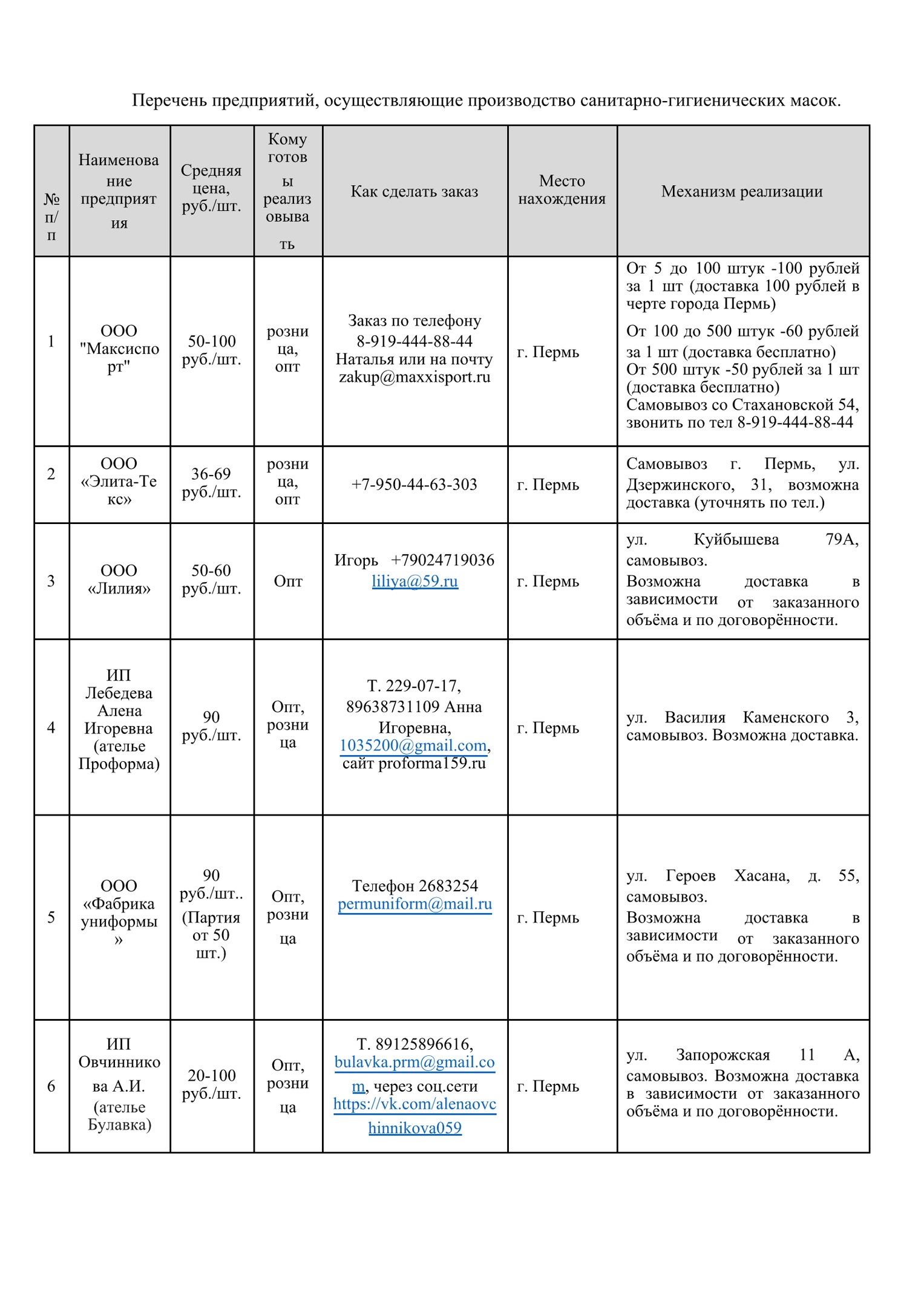 Сейчас 42 предприятия занимаются производством и пошивом масок. Где-то необходим самовывоз, где-то организована доставка. Есть возможность купить товар оптом или в розницу. Стоимость масок везде отличается. Условия можно узнать в прикрепленном документе.