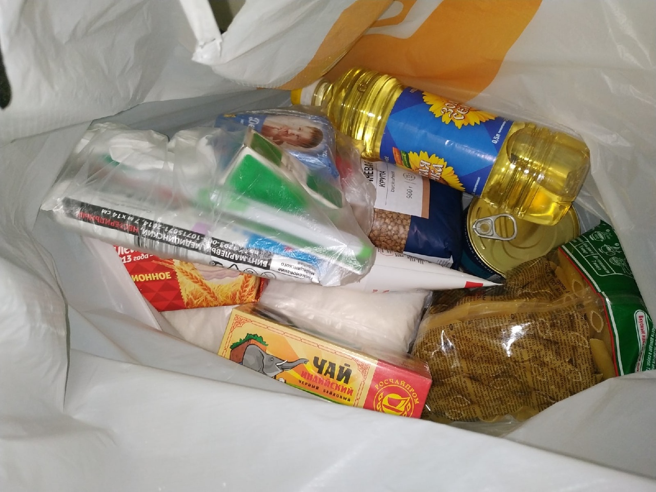 В продуктовые наборы рекомендуется складывать макароны, крупы, консервы с ключом, чай, сахар, печенье, лапшу или пюре быстрого приготовления, средства личной гигиены (зубную щетку и пасту, мыло, влажные салфетки) и средства индивидуальной защиты (маску, перчатки).