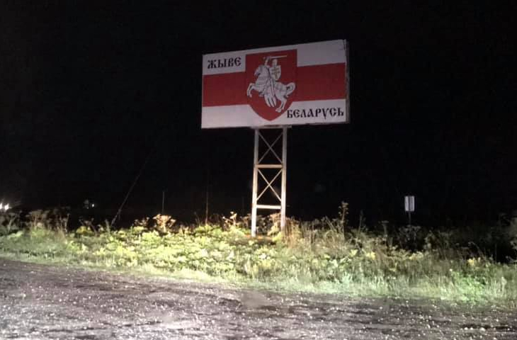 На большом рекламном щите вблизи Полазны появился белорусский патриотический лозунг начала прошлого века «Жыве Беларусь». Его сопровождает всадник на белом коне. Изображение посвящено событиям, происходящим сегодня в соседней стране.
