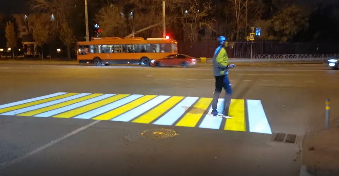 — "Самого пешехода лучше видно при такой подсветке!" Серьезно? По-моему, она как раз отлично пешеходов маскирует! Вместо того, чтобы подсвечивать пешеходов, проектор подсвечивает асфальт, — говорит Варламов.