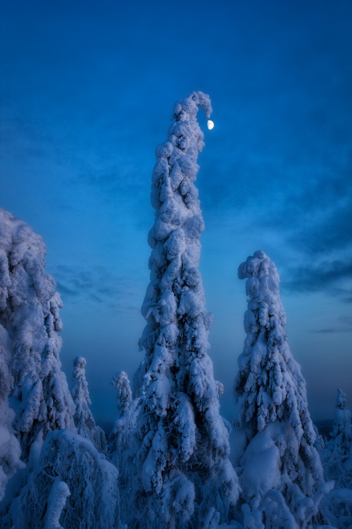 Призовое место Александр получил благодаря работе «Елочная игрушка». Пермяк запечатлел в лесу зимнюю елку, чья макушка наклонилась от тяжести снега. Очень удачно на снимке к этой макушке присоединилась луна. Выглядит, как елочная игрушка. Можно сравнить получившийся кадр и с ночным колпаком для сна.